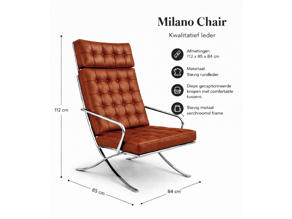 De Barcelona Chair XL Bruin kaneel is een stijlvolle en comfortabele fauteuil met een tijdloos design. Deze luxe stoel combineert een strak metalen frame met diepe gecapitonneerde kussens voor een moderne en elegante uitstraling. Perfect als lounge stoel, relaxfauteuil of chaise longue in de woonkamer, kantoor of wachtruimte.