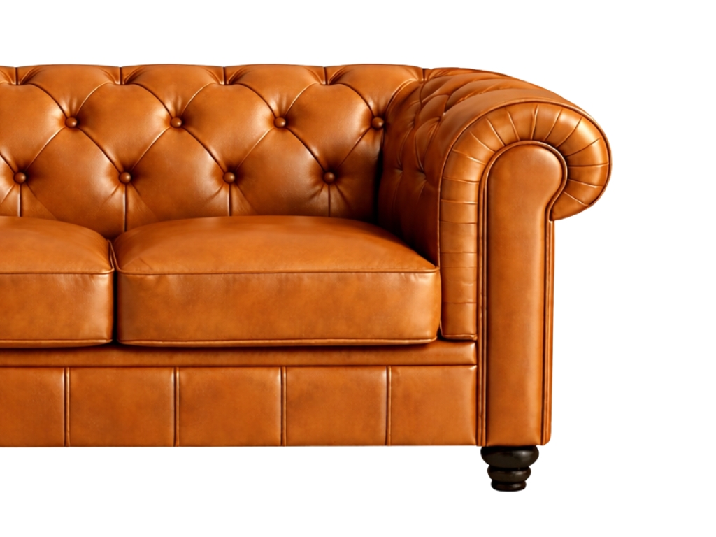 - Model: Klassieke Chesterfield, bekend om zijn diepe knopen en afgeronde armleuningen.