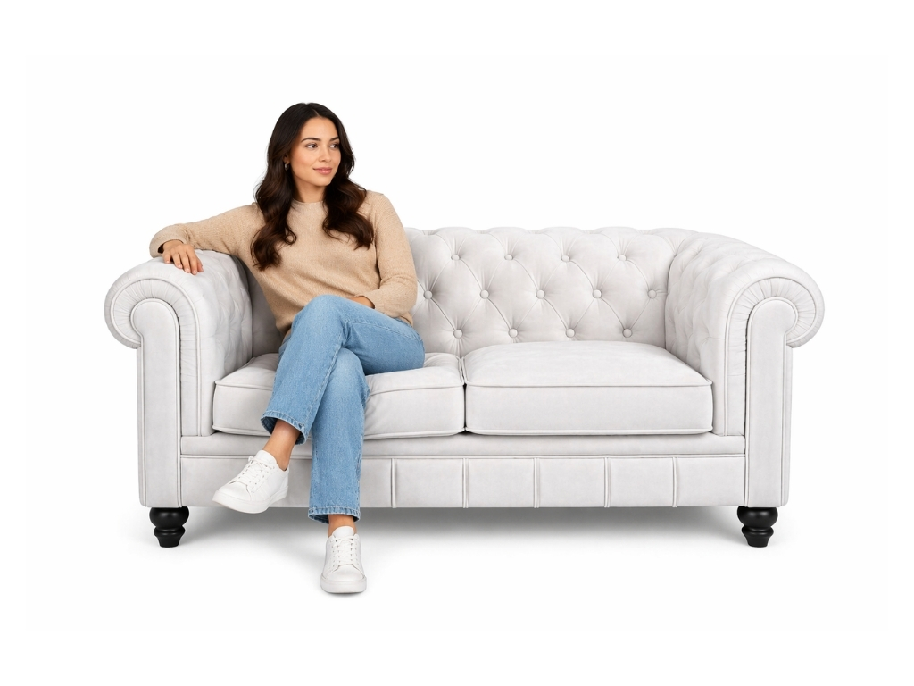 De Chesterfield 2-zitsbank in velvet wit. De klassieke Chesterfield-stijl met diepe knopen en gewelfde armen zorgt voor een tijdloze charme. De stevige houten poten bieden stabiliteit en versterken de klassieke uitstraling van de bank.