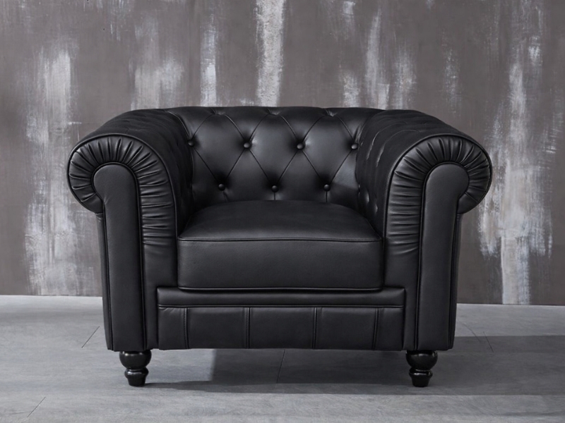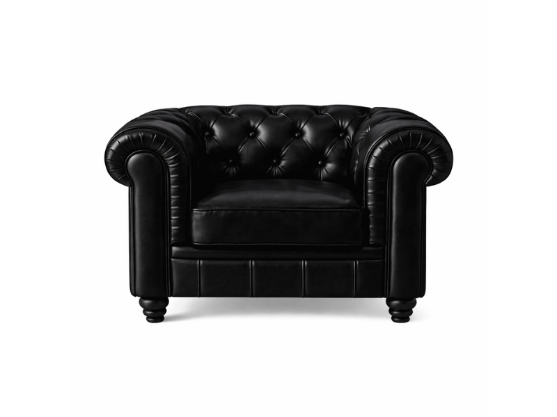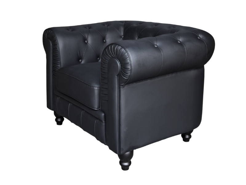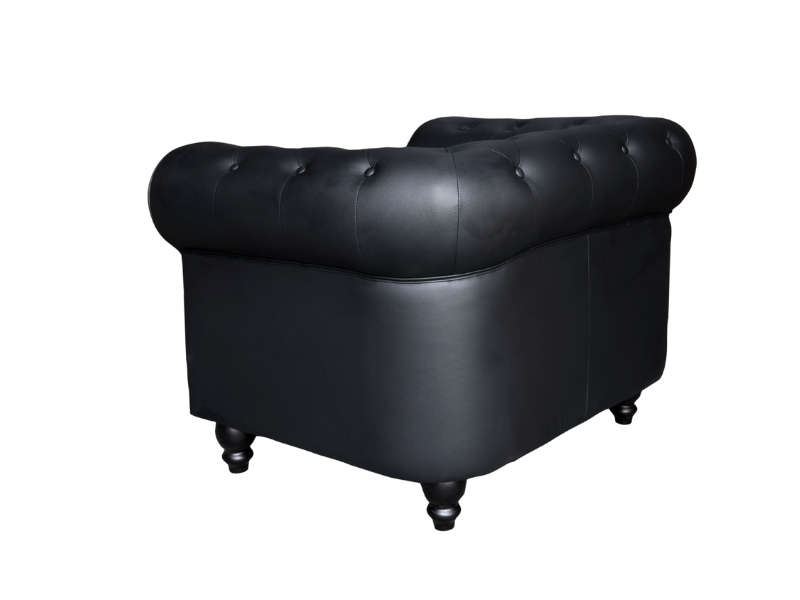 Deze Chesterfield 1-zits bank, ook wel Chesterfield stoel genoemd, heeft een strakke en tijdloze uitstraling. De stoel is uitgevoerd in zwart leer, wat zorgt voor een luxe en krachtige look. De ronde armleuningen en de knopen in de rugleuning maken direct duidelijk dat dit de bekende en geliefde Chesterfield stijl is.