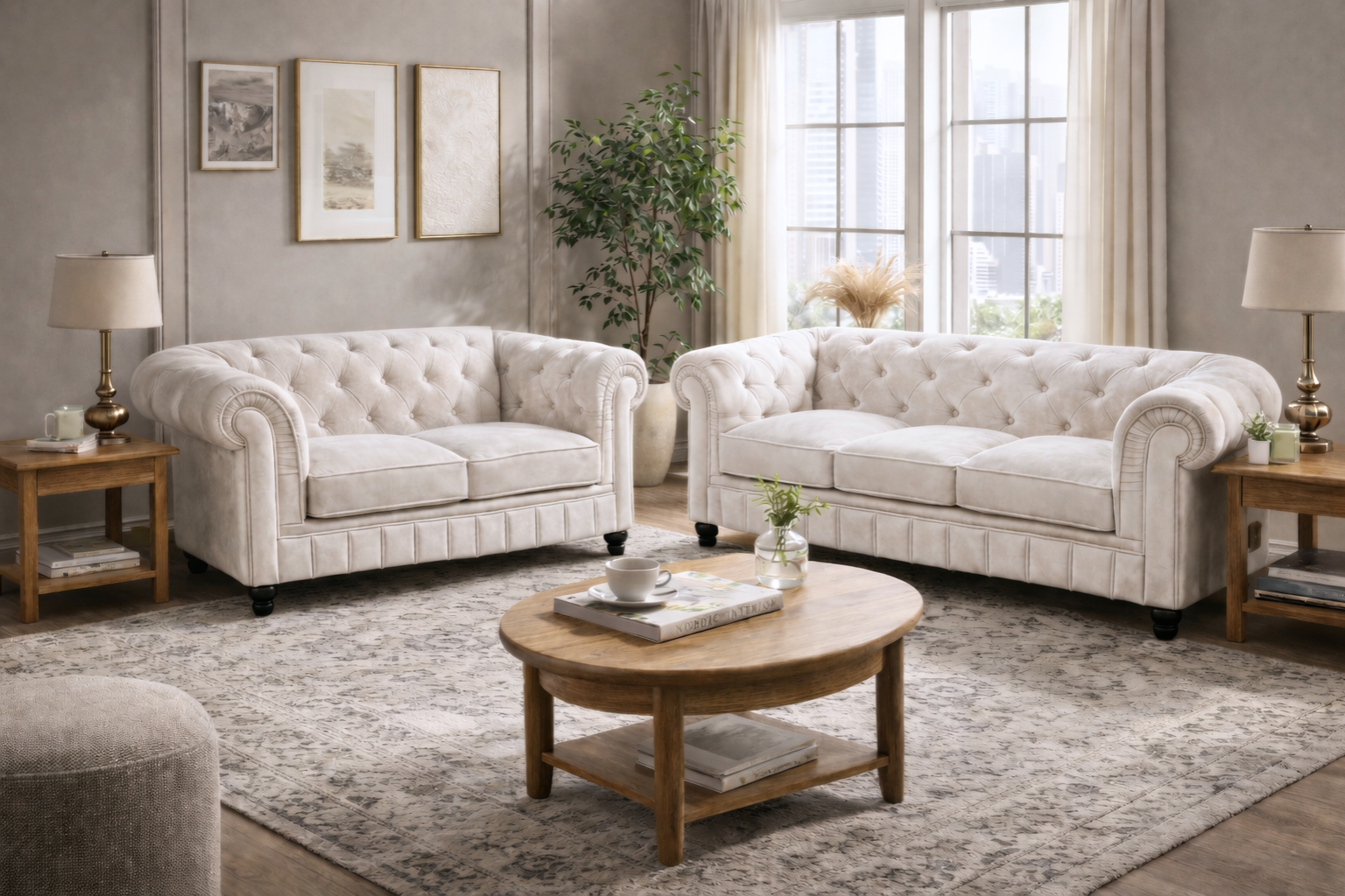 De Chesterfield Banken Velvet wit combineert stijl en comfort. Deze set bestaat uit een 3-zits en een 2-zits bank, bekleed met hoogwaardig suède leer in een warme Velvet kleur. Ideaal voor een klassiek en tijdloos interieur.