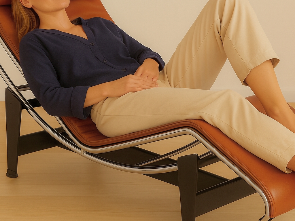De Cassina LC4 chaise longue heeft een stevig stalen frame en een gebogen liggedeelte waar je op ligt. De stoel is bekleed met rund leer en heeft een zacht kussen over de hele lengte. Onder het kussen zitten stevige elastieken banden voor extra comfort. De nekrol geeft extra steun aan je hoofd. De zitting rust los op het onderstel, waardoor je de hoek makkelijk kunt aanpassen. Alles is netjes afgewerkt en gemaakt van duurzame materialen, zodat de fauteuil lang meegaat